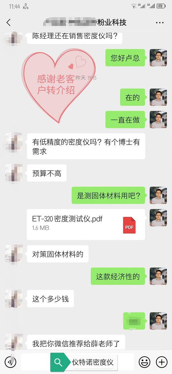 做業(yè)務(wù),有客戶幫忙介紹生意,而且還是多年以后,這真是件幸福的事情,客戶之所以幫你推薦客戶,是因為對你產(chǎn)品質(zhì)量的認可。每個人手上的資源都不多,能給介紹客戶資源,這是絕對的真愛,也是對你產(chǎn)品和人品認可后的動作。這種來之不易的幸福,能夠激勵我們持續(xù)做好密度儀的品質(zhì)和服務(wù)。