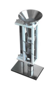斯科特容量計法測試松裝密度是指把粉末放入上部組合漏斗中的篩網(wǎng)上,自然或靠外力流入布料箱,交替經(jīng)過布料箱中的四塊傾斜角為25°的玻璃板和方形漏斗,最后流入已知體積的圓柱杯中,呈松散狀態(tài)。然后稱量圓柱杯中的粉末的質(zhì)量計算所得之密度值。